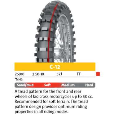 The Mitas C12 has a tread pattern for the front and rear wheel of kids motocross dirt bikes. This high-performance mini motorcycle tire is designed for any rider from an aspiring pro to an occasional rider. Recommended for soft terrain, the tread pattern is designed for optimum performance in many riding conditions. Â